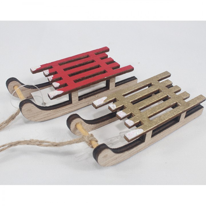 Wooden sledge 9×3,6cm, w. snow, 2-fold assorted with cord and wooden ball